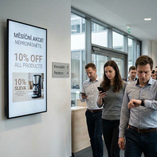 Výsledek? Kolemjdoucí ani zaměstnanci si obsahu přestali všímat během dvou týdnů. Mozek ho vyhodnotí jako „součást kulisy“ a přestane ho zpracovávat. To, co bylo tři měsíce zpátky prodejní nástroj, je dnes tapeta.